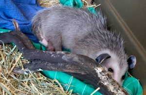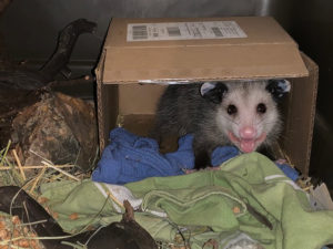 I’ve only touched him once – when I transferred him at Native Animal Rescue (NAR) into a large plastic dog crate to bring him to my house until he can be safely returned to the wild. Release is always the end goal with NAR, and in the meantime, the intention is to keep the animals as feral as possible. This juvenile male opossum, about five inches long, promptly scurried into the small cardboard box in the very back of the crate, his little face peering out. His black eyes looked more like a pool of water than solid matter.