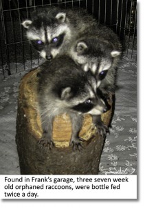 In the late spring of 2009, a raccoon had her litter under a riser in our garage. This wasn’t the first time, and it’s always cool to hear the babes’ little noises and to know that life is renewing right under our noses. This time though, when the kits were about five weeks old, their mother didn’t return. We found raccoon fur on our property and suspected a bobcat or coyote got her.