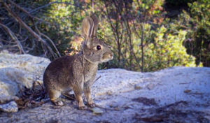 But maybe the sweetest part of my morning is the small brown rabbit who creeps out from under the white sage bush and methodically chews one seed after another. Silhouetted, her dark round eye peers out toward me. When I lean steadily closer with no abrupt movements, murmuring in what I hope is a reassuring tone, I can watch from only several feet away. Like a smitten lover, I tell her how perfect she is, particularly her cream-colored feet that stick out from under her rounded torso, and then there’s that fluff of a tail.