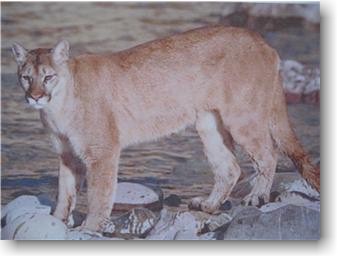 Mountain lions (Felis concolor) are the largest native North American cat except for the slightly larger Jaguar. The mountain lion is called by more names than any other mammal – cougar, puma panther, catamount or simply – lion. Adult mountain lions are more than seven feet long with a 32 inch tail. Their color is tawny with black tipped tail and ears. The males are generally larger than females weighing 130 to 150 pounds. The females weight ranges 65 to 90 pounds. Their height at the shoulder is 25 – 30 inches.